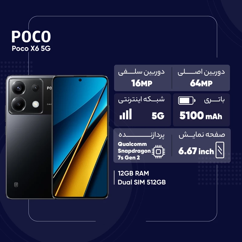 اگر به دنبال خرید گوشی هوشمند میان‌رده‌ای هستید که در کنار بهره بردن از مشخصات فنی مناسب و البته قدرتمند، قیمت مقرون به‌صرفه‌ای هم داشته باشد، باید بگوییم که گوشی‌های سری poco شرکت شیائومی می‌توانند انتخاب بسیار مناسبی برای شما باشند. شیائومی Poco X6 5G یکی از میان‌رده جذاب و دوست داشتنی این شرکت است که به نسبت قیمت در نظر گرفته شده، از مشخصات فنی مناسب و قابل قبولی بهره برده است. در نمای رو‌به‌رویی این گوشی به صفحه‌نمایش با ابعاد ۶٫۶۷ اینچ و رزولوشن ۱۲۲۰×۲۷۱۲ پیکسل از نوع امولد با نمایش ۴۴۶ پیکسل در هر اینچ مجهز شده است. از قابلیت‌های قدرتمند این صفحه‌نمایش می‌توان به نرخ بروزرسانی ۱۲۰ هرتز و حداکثر روشنایی ۱۸۰۰ نیت (nits) اشاره کرد. با این تفاسیر عملکرد روان و بدون لگ و البته وضوح تصویر بسیار خوبی را از این صفحه‌نمایش حتی زیر تابش مستقیم نور خورشید شاهد خواهید بود. در قسمت پشتی یک سنسور دوربین اصلی با رزولوشن ۶۴ مگاپیکسل در کنار سنسور ۸ مگاپیکسل فوق‌عریض و سنسور ۲ مگاپیکسل ماکرو در نظر گرفته شده. حضور سنسور دوربین اصلی قدرتمند سبب شده تا شاهد عملکرد بسیار خوب در عکاسی نور روز و نور شب باشید. لازم به ذکر است که دوربین اصلی این گوشی توانایی فیلمبرداری ۴K با نهایت سرعت ۳۰ فریم در ثانیه را هم دارد. دوربین سلفی ۱۶ مگاپیکسل هم به‌خوبی توقعات شما را در زمینه عکاسی و در جایگاه یک گوشی میان‌رده بر‌آورده می‌کند. حضور پردازنده قدرتمند اسنپدراگون ۷s نسل دوم شرکت کوالکام سبب شده تا شیائومی Poco X6 5G عملکرد کاملا قابل قبولی در اجرای بازی‌های محبوب و نرم‌افزار‌های کاربردی داشته باشد. باتری ۵۱۰۰ میلی‌آمپرساعت در کنار پشتیبانی از فناوری شارژ سریع ۶۷ وات، از دیگر مشخصات در نظر گرفته شده برای این گوشی هستند. در مجموع باید بگوییم که اگر به دنبال خرید گوشی میان‌رده‌ای هستید که به صفحه‌نمایش بسیار باکیفیت، دوربین اصلی قدرتمند، پردازنده مناسب برای بازی و باتری قابل قبولی مجهز شده باشد، شیائومی Poco X6 5G می‌تواند انتخاب بسیار مناسبی برای شما باشد.